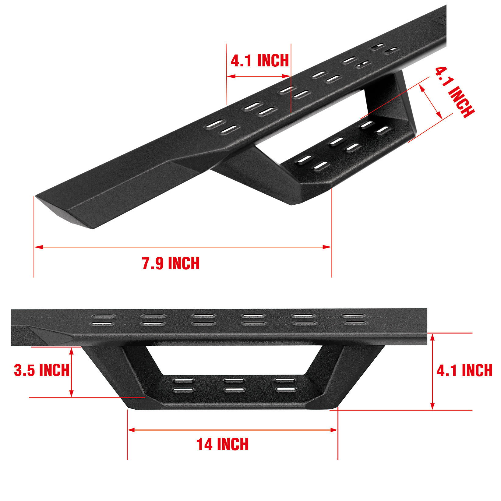 • The unique drop-down style nerf bar has an open wide step area (length: 14 inches; width: 4.